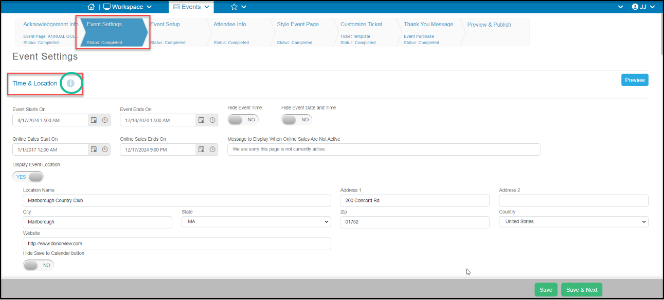 This step allows you to enter all the general information about the event like location, time, website, etc. It is sorted into several sections as described below. You can click on the Information icon ("i" next to the section label shown with the green circle around it below) to get more details about the features in each section.