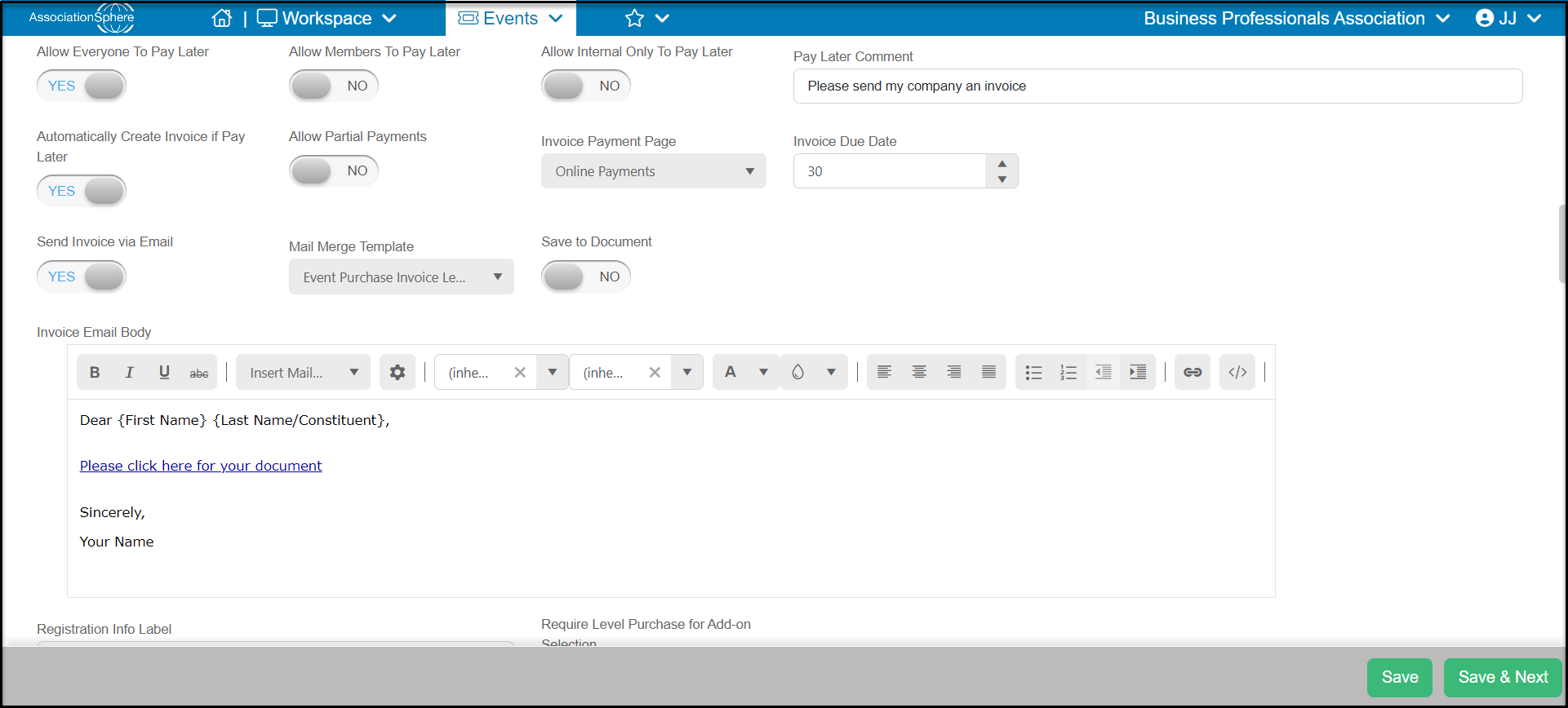 - If you are creating invoices, you can also send the invoice as a separate email to the registrant. Turn Send Invoice via Email to YES, and choose the Mail Merge Template (from Mail Merge Invoice Templates). If desired, you can Save to Document to save the invoice and cover letter in the constituent's Documents tab. You can also customize the Invoice Email Body.