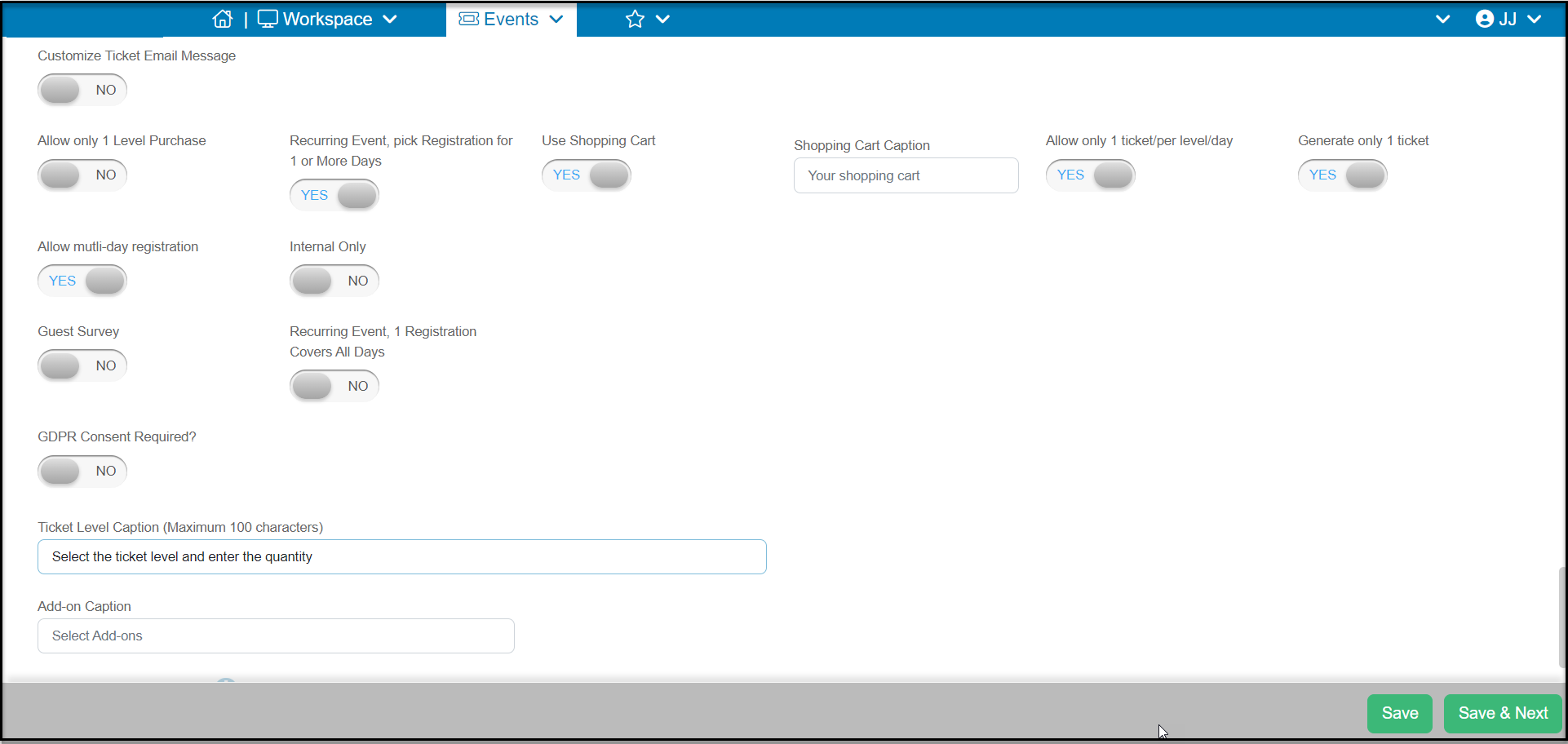 - If you want all the tickets levels registered to be included in a single ticket, mark Generate only 1 ticket to YES. If this is NO, each ticket level will be on an individual ticket.