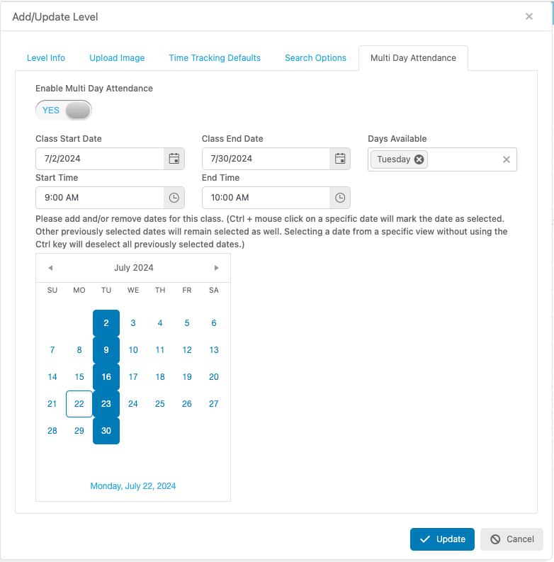 - Enable Multi Day Attendance – When set to Yes, this will allow you to make your multi day selections.