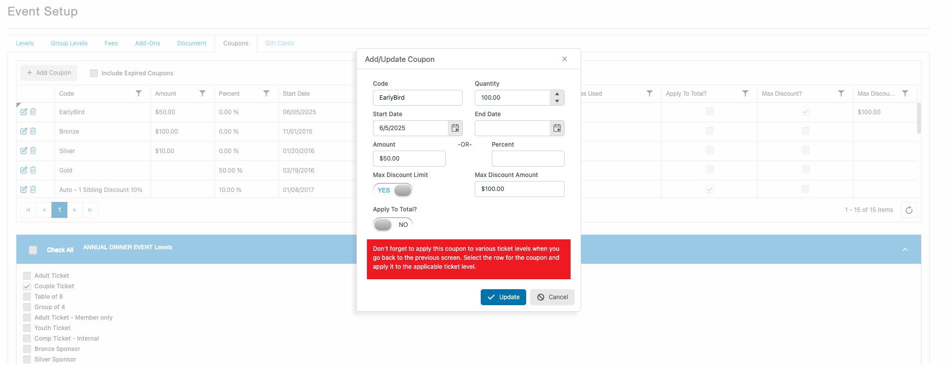If you did not select Apply to Total, you will need to add a check mark next to the event levels that are eligible to use this coupon.