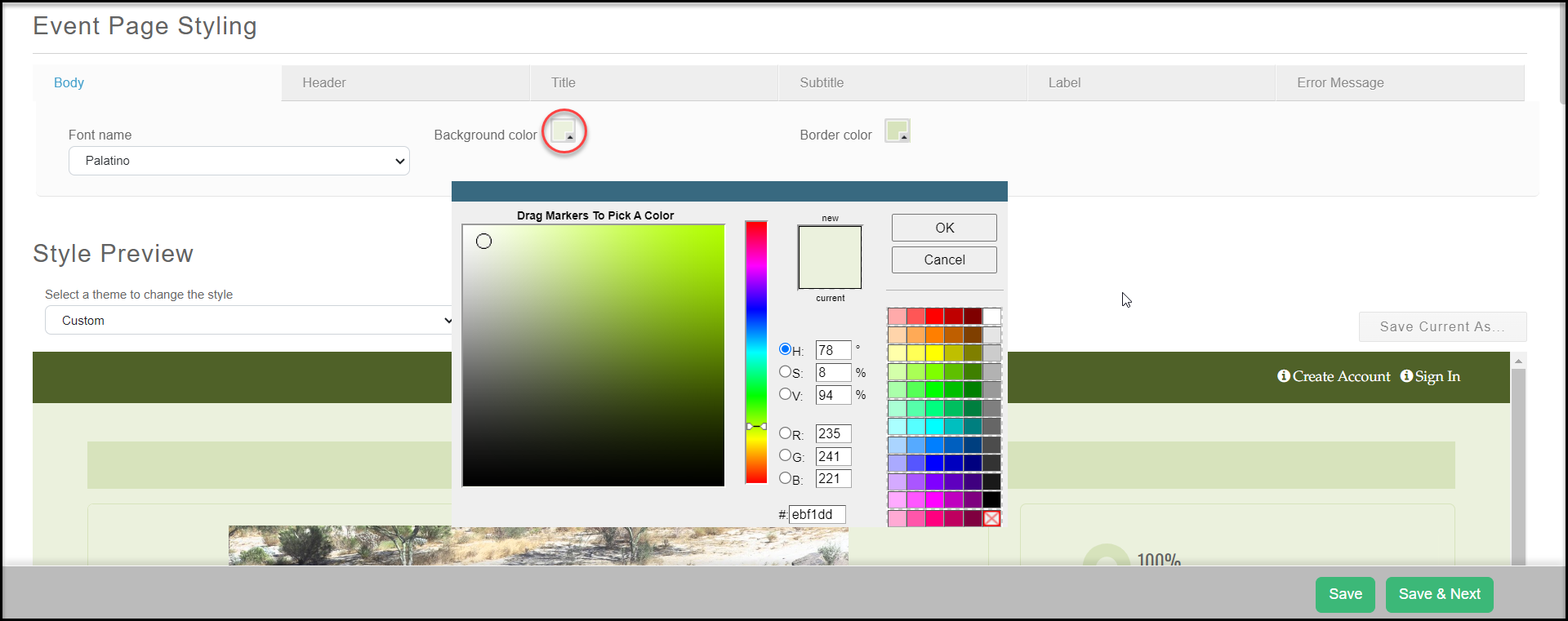 On the Body tab, you can edit the font in the body of the page by choosing from the Font Name dropdown list. Clicking in the square next to Background color and Border color will open a new window to allow you to choose the color by mousing over the color picker or by entering the appropriate HSV, RGB or HEX color code.