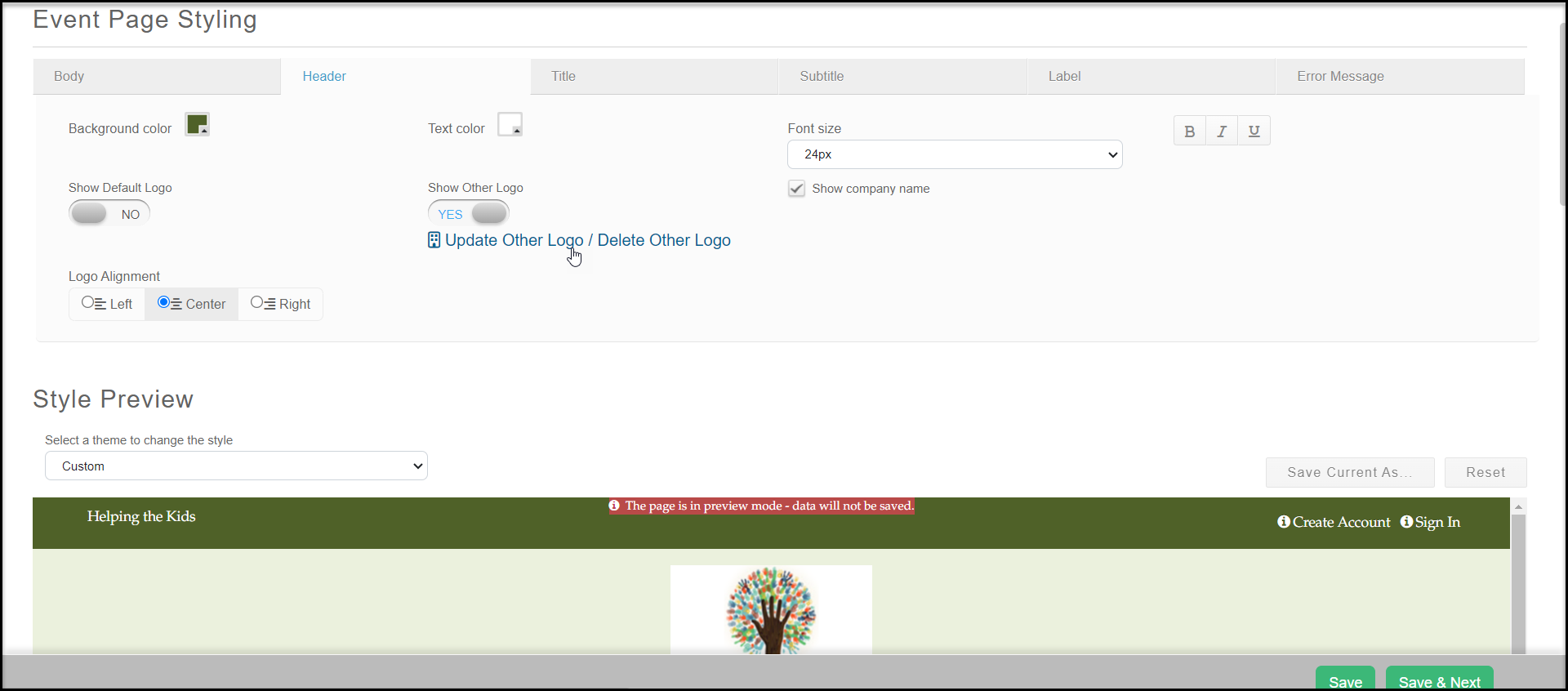 On the Header sub-tab, you can customize the Background color, Text color, Font. By setting the toggle to YES on the Show Default Logo or Show Other Logo you are able to add your default or alternate logo from your account settings to the top of the page. You can also choose the Logo Alignment. Note that if you click on Update Other Logo/Delete Other Logo it will affect all of the pages where this other logo is used.