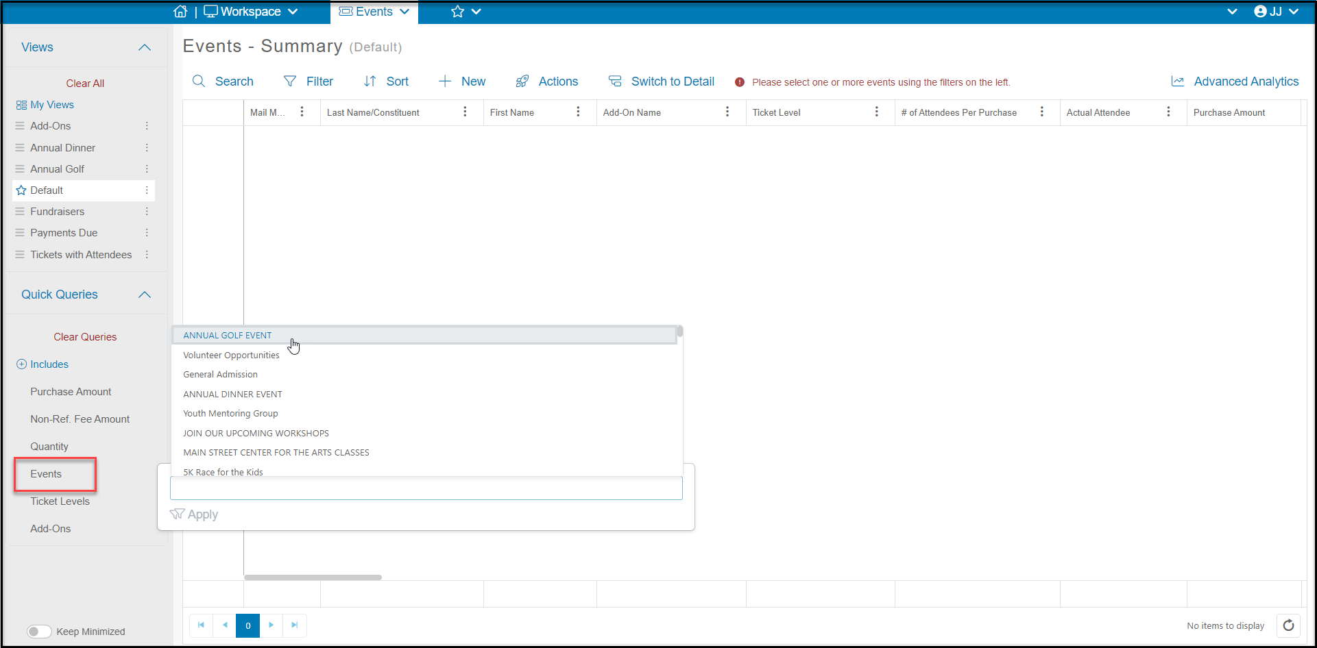 Event registrants are constituents and their information will appear on the Constituents grid, however there is no information about the event they are registered for. To see information about the event including information about the event registrants, go to the Events grid located in Workspace> Events> Events. Select the event or events to show on the grid from the side bar search menu.