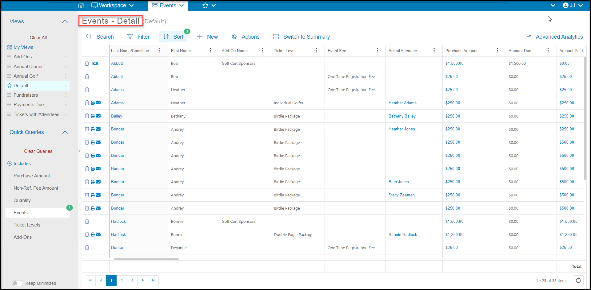 Switching to the Detail View will show the registrants listed under Last Name/Constituent and the attendees/guests listed under Actual Attendees. Note that you may have to scroll over in the rows to find the attendee columns depending on how you have your grid view set up.