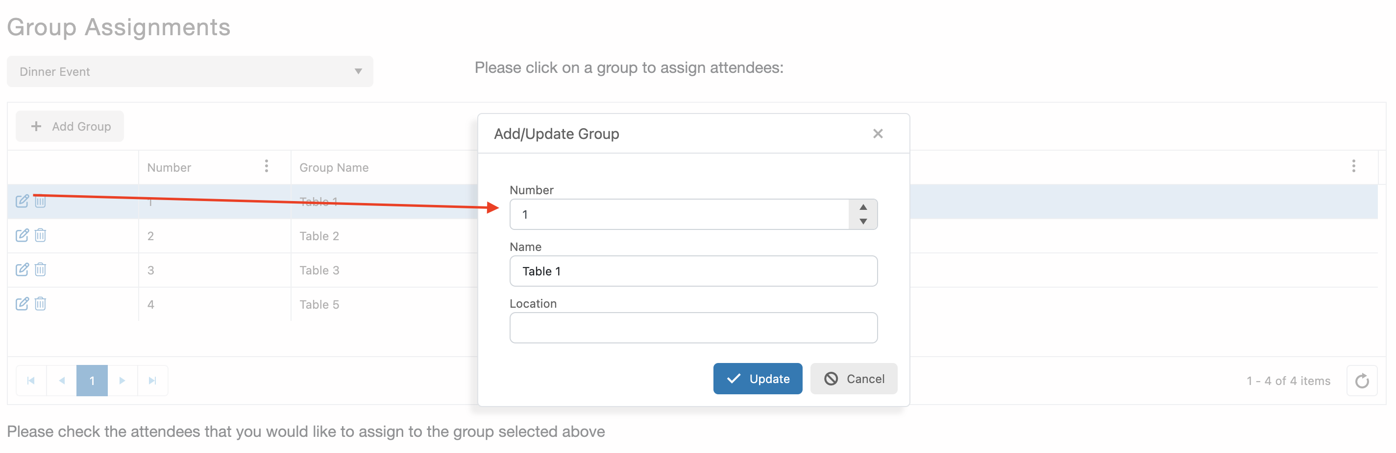 Yes, on the Groups Grid there is a blue edit icon on each row that allows you to edit the Number, Name and Location of each group. Click Update to save the changes. The updated information will show on the assignments list below and on the Event Attendance grid.