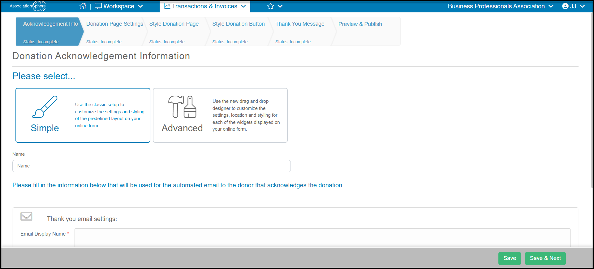 The Acknowledgement Info tab is the first step to creating a new donation page. It can also be edited as needed. The tab allows you to choose your page creation method, Simple or Advanced. And it sets up the donation acknowledgment information. After choosing the type of page created, there are four required fields: