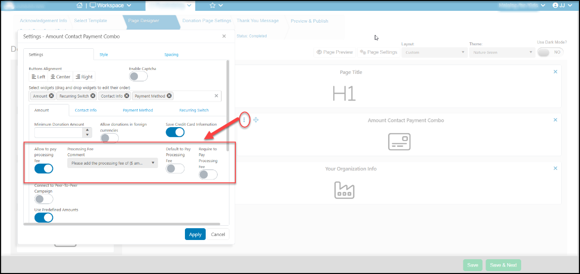 In the Advanced Page Designer process, you can activate this option by clicking the three dots on top left side of your payment widget. Click on Widget Settings, and then in the Settings tab you can activate it by setting Allow to pay the processing fee to YES. You can also choose the sentence and default or required options.
