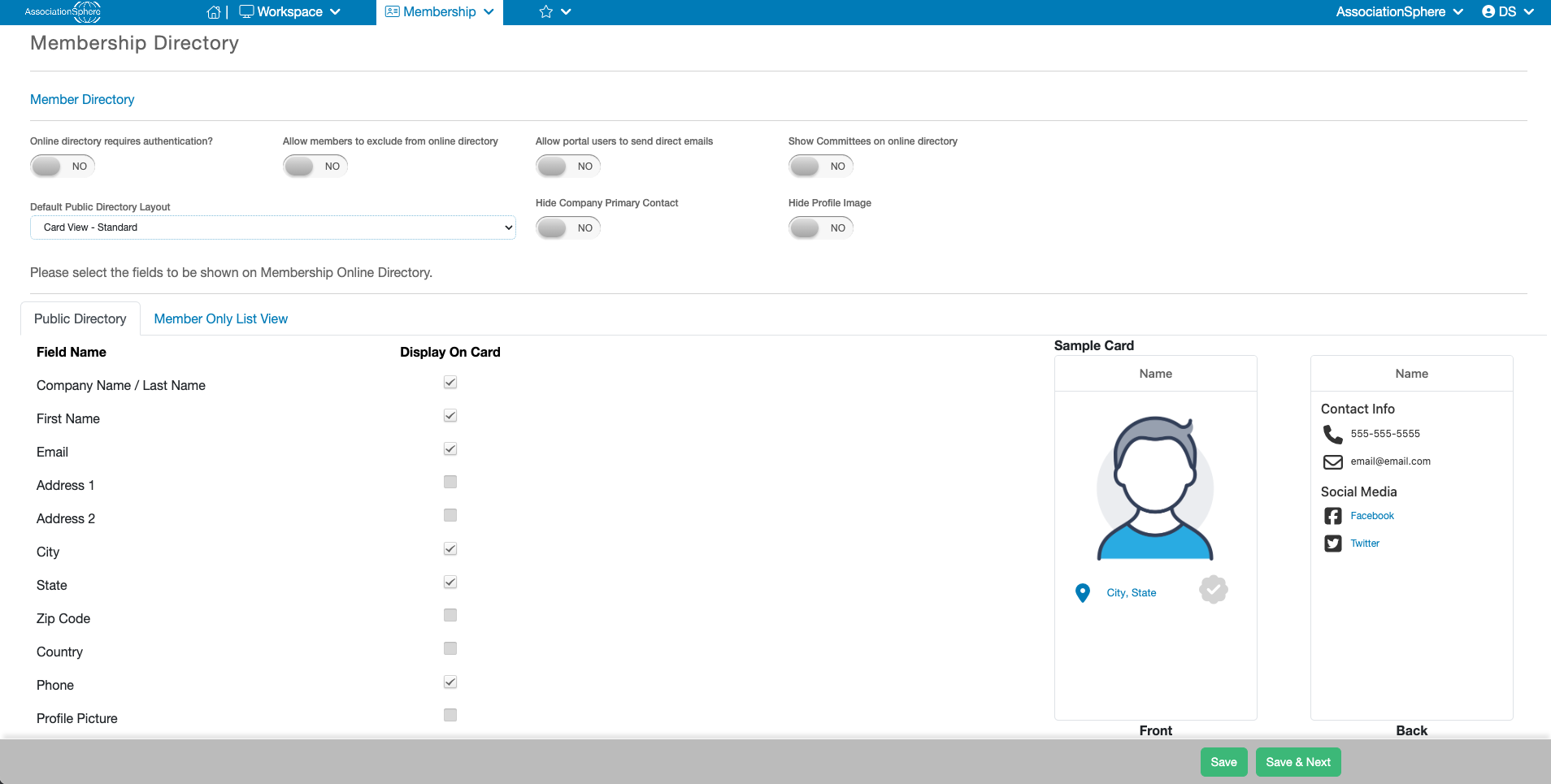 After completing those settings you will see two tabs, “Public Directory” and “Member Only Directory”. The Card View will only be available for the Public Directory”. On the Public Directory tab you will see a list of Field Names available to be displayed on the Card and column called, “Display on Card” with a Checkbox on each row so that you can select whether each field should or should not be displayed. A checkmark will display the field while no check will hide that information.