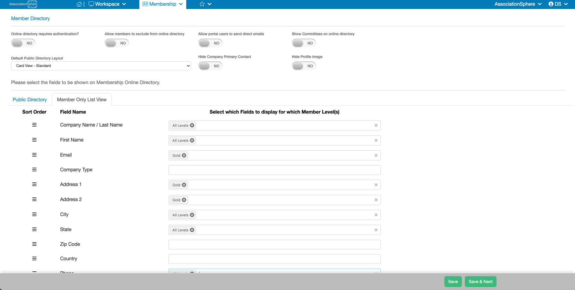 Based on the settings above you will now see two tabs titled, “Public Directory” and “Member Only Directory”. The settings on each of those tabs will allow you to customize which fields of data are displayed on the two directories by selecting for which Membership Level(s) each field should be displayed for.