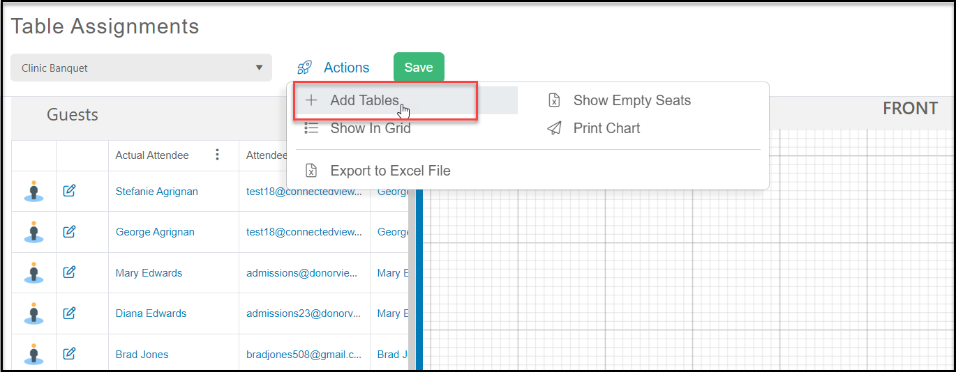 With the event selected, ff you have not selected a table template, you can start adding tables from scratch by hovering over the Actions menu and clicking on + Add Tables.