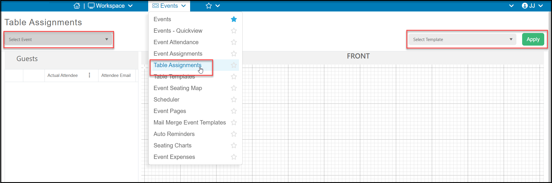 Once you have this activated, you will be able to see your event on the Events Module > Table Assignments page. On the left side of the page you will select your event from the Select Event dropdown. With the event selected, if you would like to use a table template you have created, you can select it from the dropdown menu under Select Template on the right side of the page. Click Apply to upload the template. You can learn more about table templates here: https://support.donorview.com/en/support/solutions/articles/9000213210-can-i-save-a-table-assignment-layout-as-a-table-template-