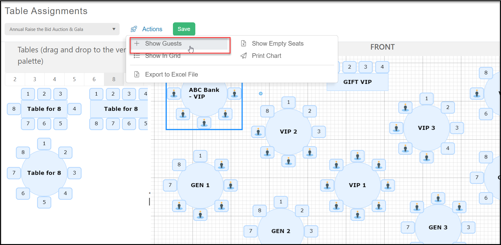 With a few tables added to your layout, you can then switch to the attendee list by hovering over the Actions menu and clicking on + Show Guests.