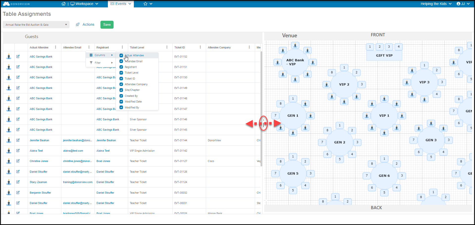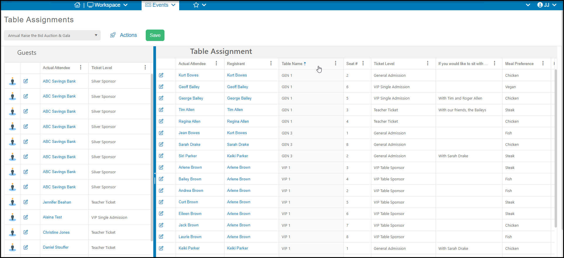 The right side of the window will show attendees who have been seated already under Table Assignments. This grid also has Column Settings and can be filtered and sorted as desired. The left side will show any guests who have not yet been assigned to a seat.