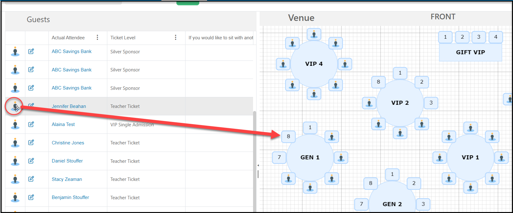 To seat an attendee, click on the person icon of the left side of the row and drag and drop it into the seat at the desired table. Once seated, they will not longer show on the left grid.