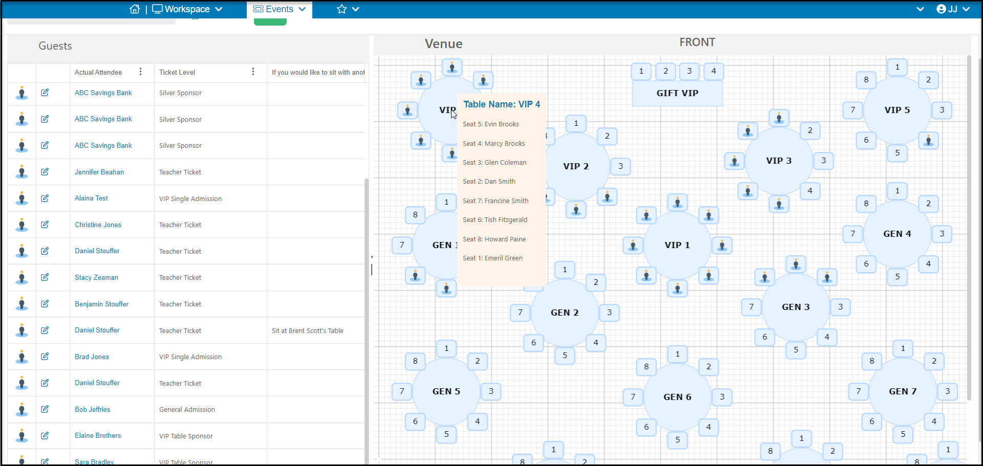 You can hover over any table or seat to see who is seated there. You can also continue to move attendees by dragging and dropping them into their seats.