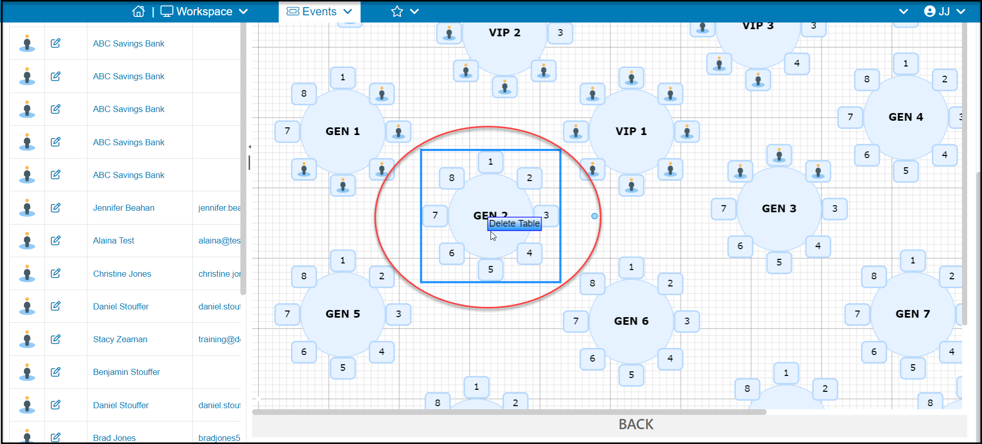 The table assignments feature allows you to create a table map of your venue and assign attendees to a table. The table assignments feature must be activated on the event page on the Attendee Info tab.