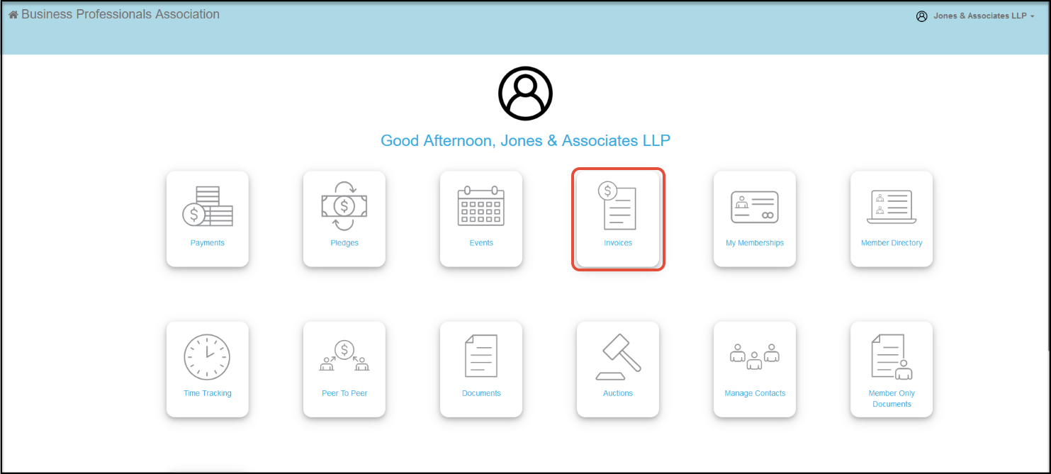 If you have the Advanced Portal activated and you have selected Invoices from the list of options, your constituents can use the portal to see a list of all their invoices and make payments using the Invoices icon.