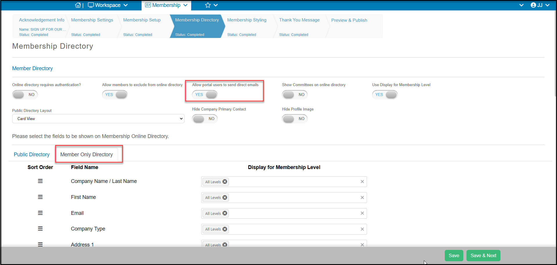 The directory will display the fields you have included in the Member Only Directory options selected on the Membership Directory tab of your membership page. This tab also allows you to authorize members to email other members from the portal.