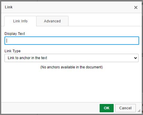 Select the Link Type as Link to anchor in the text, and enter the Display Text for your link.