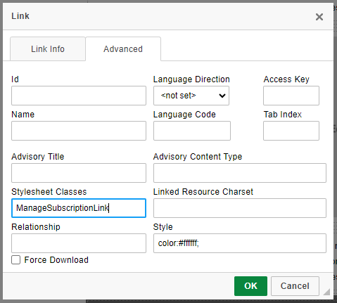 On the Advanced tab, set the Stylesheet Classes field as follows: