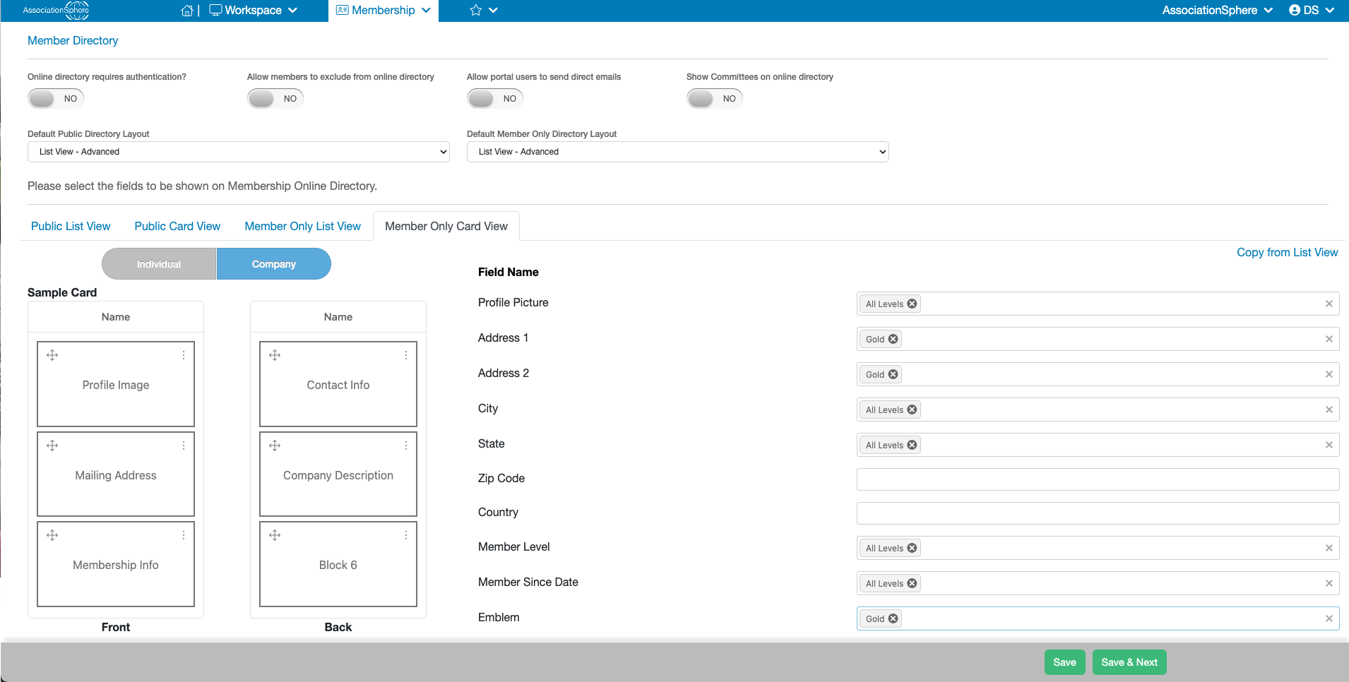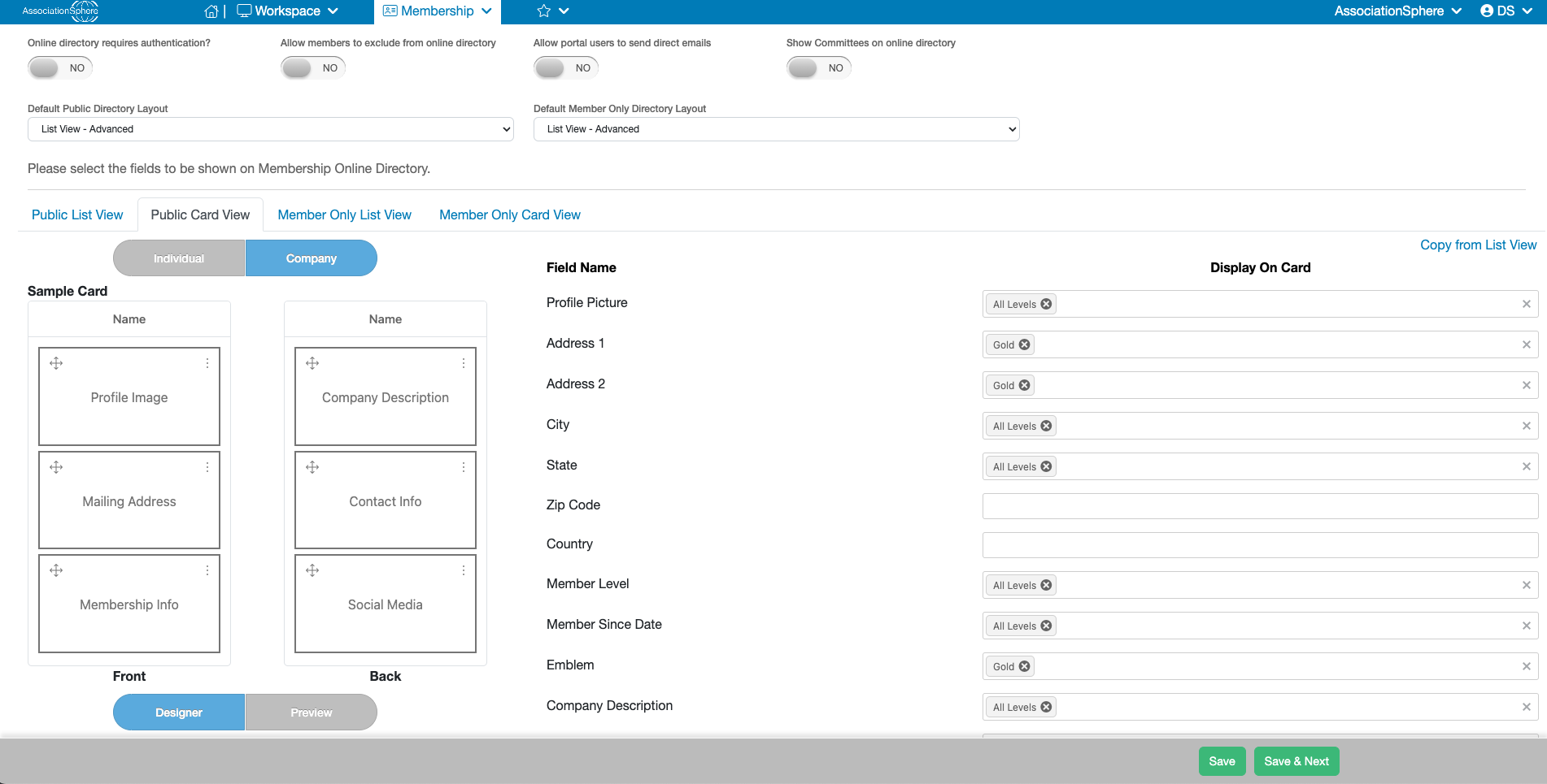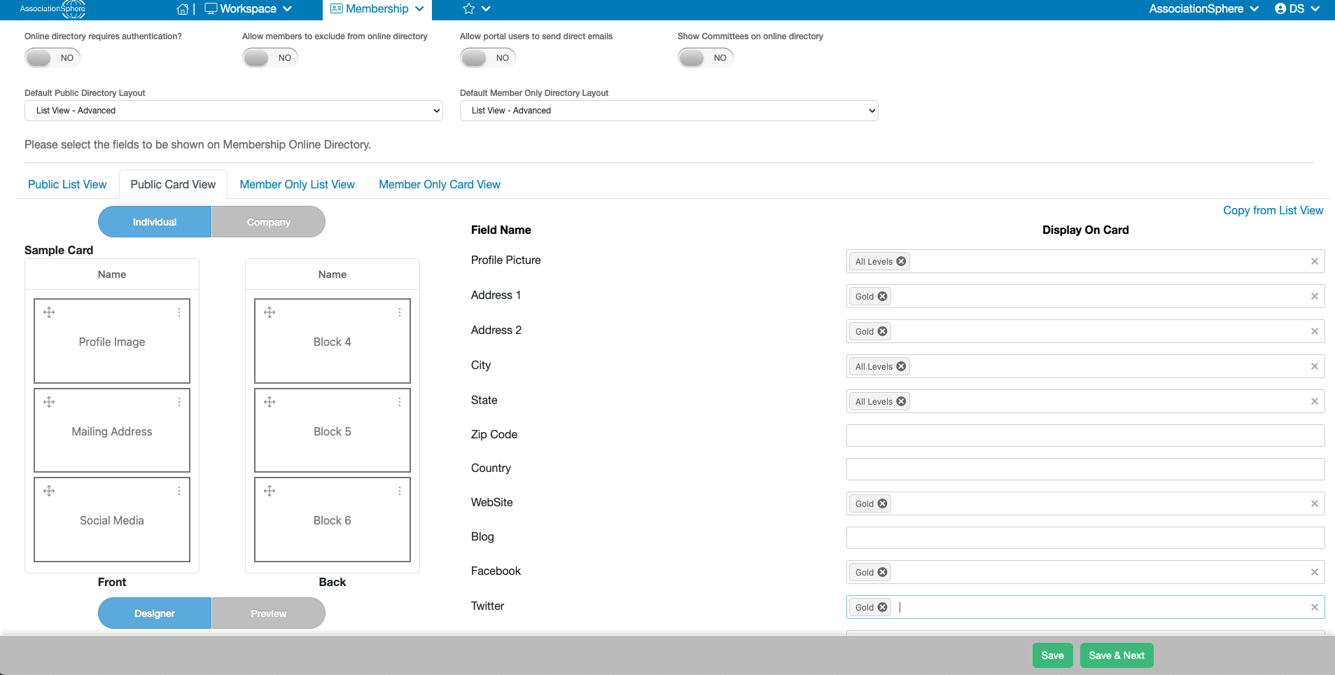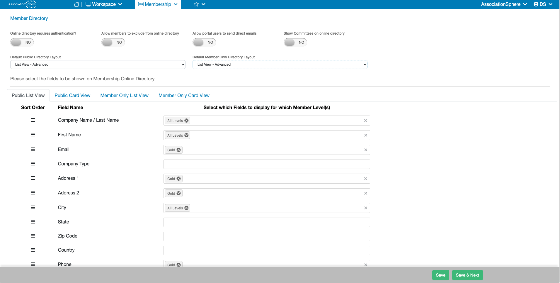 The first design tab is the Public List View. This tab will allow you to customize the List or grid view of member data that public individuals would be able to see if the directory is embedded on your website. When designing this view users can reorganize the fields using the 3 line move icon on the left and drag and drop each field into the desired position. The higher the field placement the closer it appears to the start of the directory grid. Once the positioning is site users can now select for each individual field which Membership Level or Levels that field should be displayed for. You can choose “All Levels” if you want every membership to have that field of information displayed or you can select the specific level name or names that you want that information displayed for. You can also make no selection and which will cause that field to be hidden from the List View. This process would continue for each field.