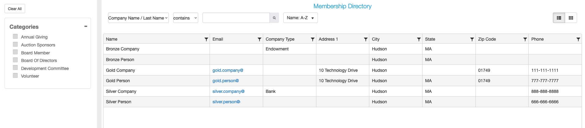 The newest version “Advanced” will allow user to select which View should be the default on the Public directory verses the Member Only Directory. Both views of the directory (List/Card) will be available to the Public and Member Only Directories but your selection of the default view will determine which view is displayed when the directory loads. The List view will display the member data on a grid with rows and columns. The Card view will display the member data on a vertical business card with two sides of display area.