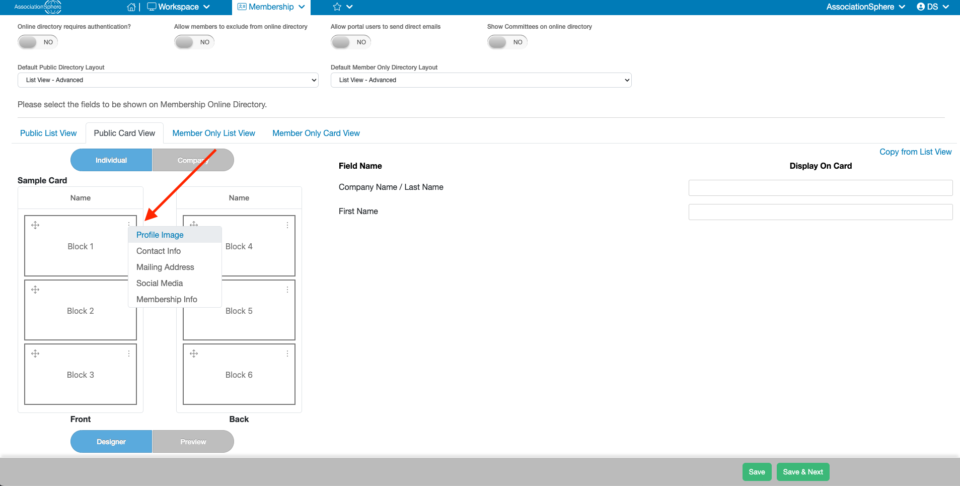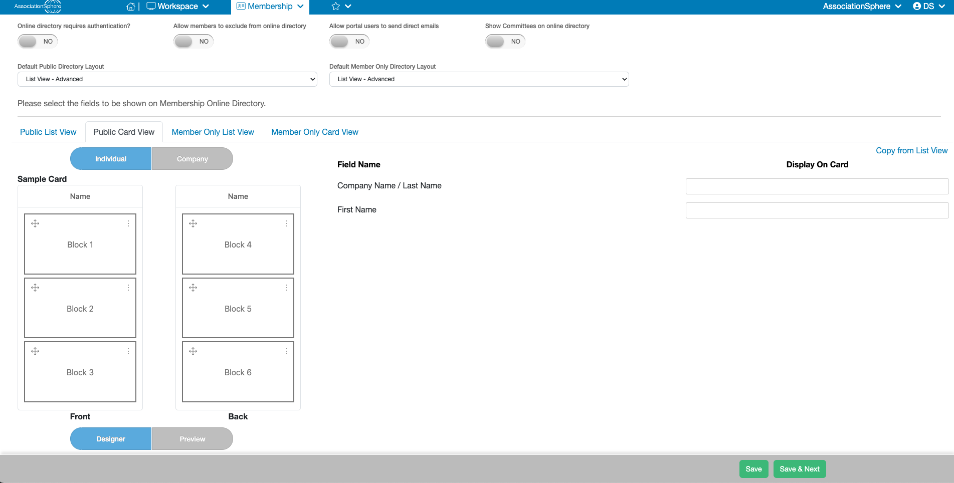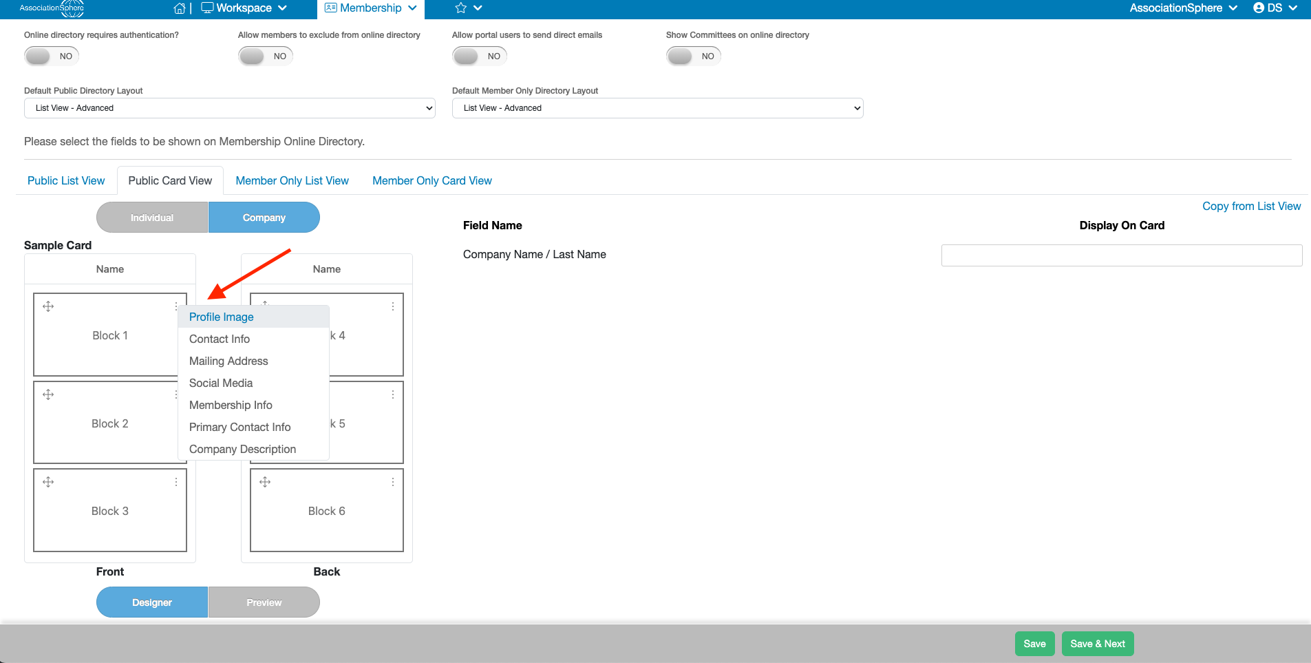 The second design tab is the Public Card View. This tab will allow you to customize the business card view of member data that public individuals would be able to see if the directory is embedded on your website.