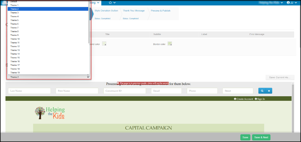 The theme dropdown is a list of built in color and font themes that you can assign to your donation page.