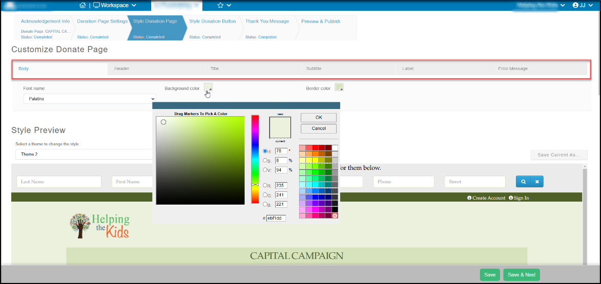 Once you select a theme, you can edit continue to customize the color and font selections using the sub-headers for the Body, Header, Title, Subtitle, Label, and Error Message. For example, to change the background color for the page, click on the Background color box to open a color picker to select your custom color.