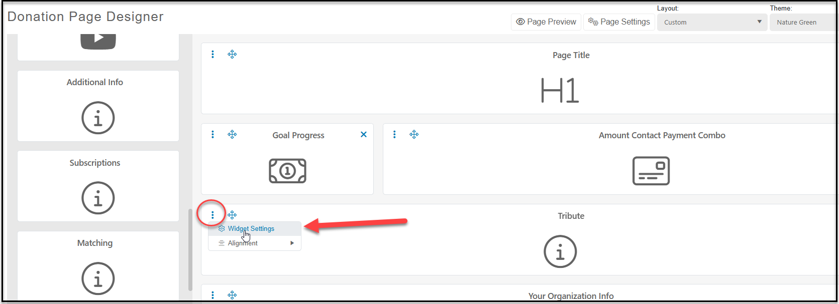 To add a tribute widget to your donation page in the Advanced Page Designer, go to the Page Designer tab, then drag the Tributes widget onto the page where you would like the information to appear on the page.