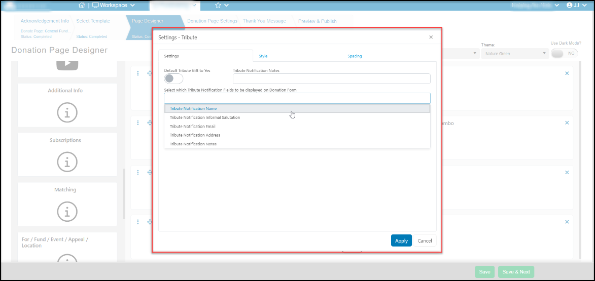 You can choose to make tributes the default, or leaving this deactivated with show a toggle the donor can turn on as desired. You can also select from the dropdown list which fields you wish the donor to complete. They will complete the name of the tributee by default, but you can also collect the Notification Name, Information Salutation, Email, Address, and Notes about the tribute. Click Apply to save the changes.