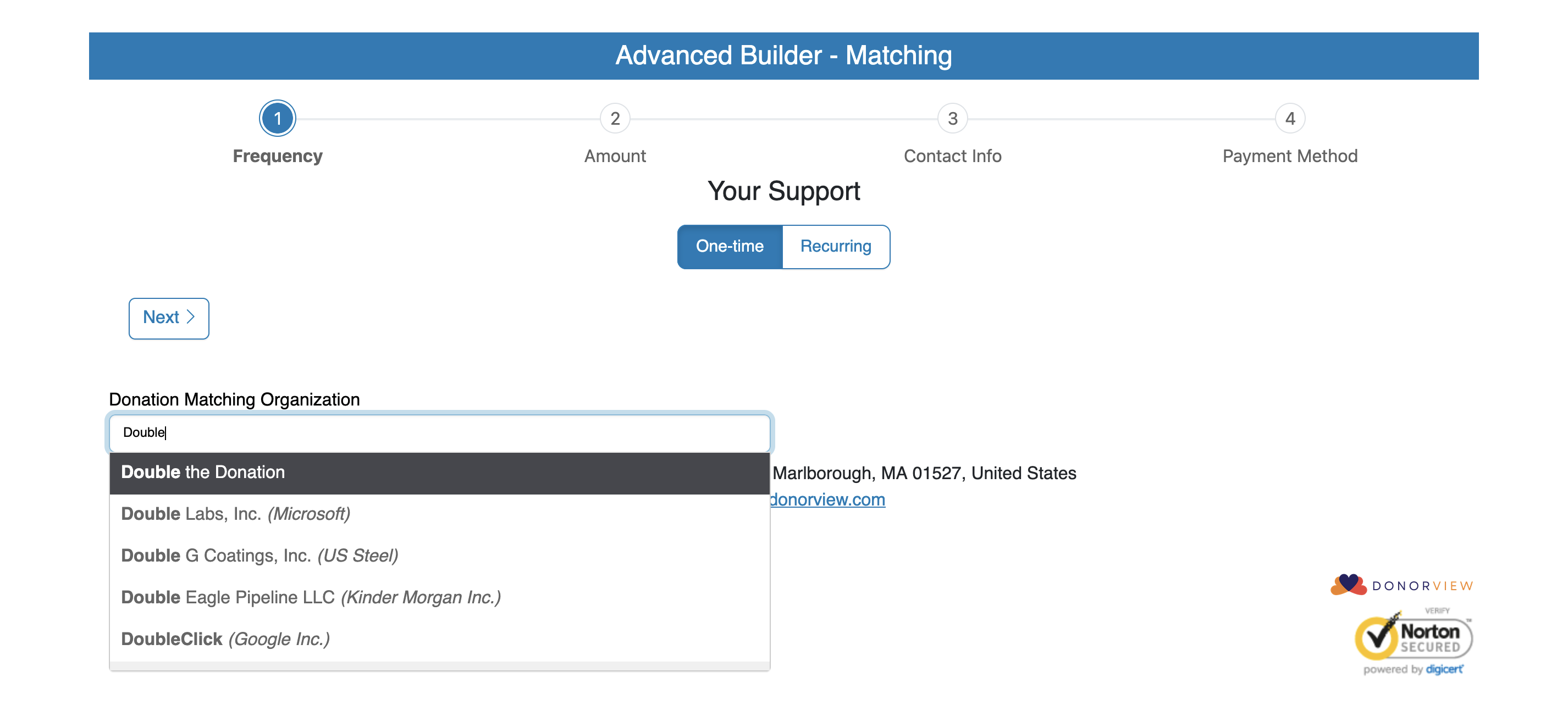 As with the Simple setup, this will allow donors to enter their employer and trigger company-specific matching instructions provided by Double the Donation.