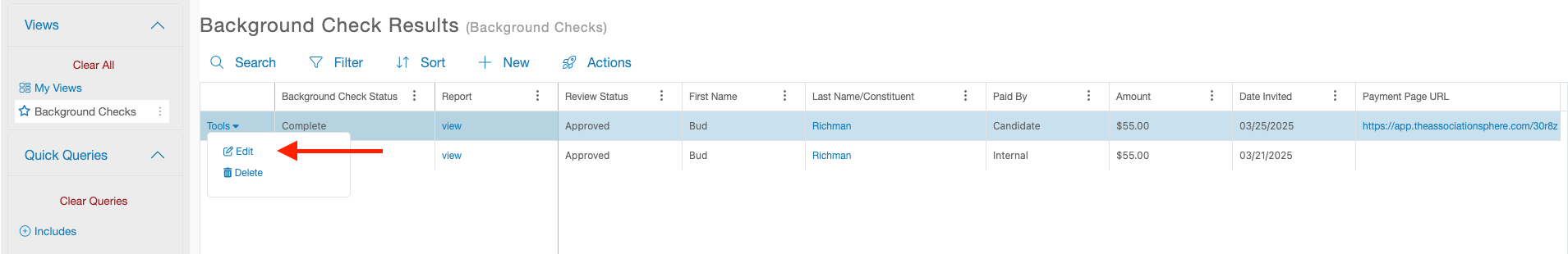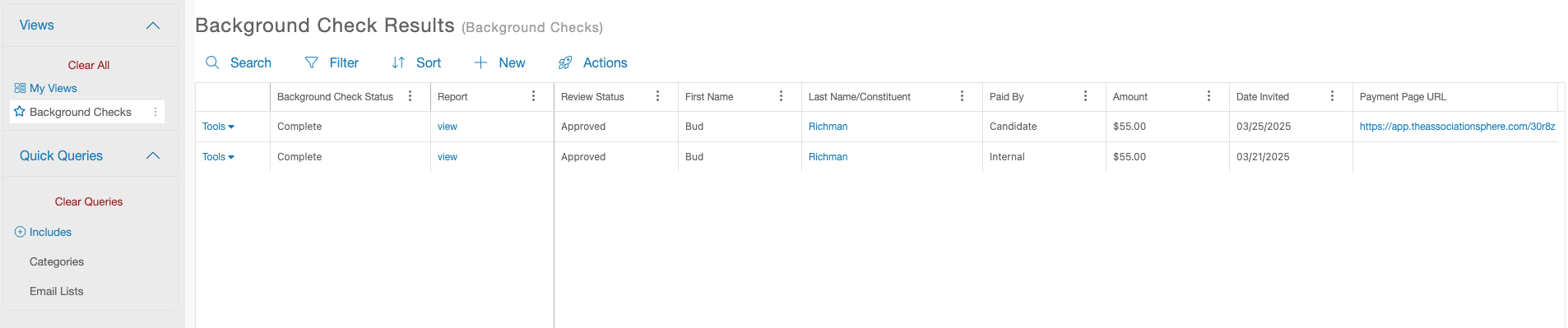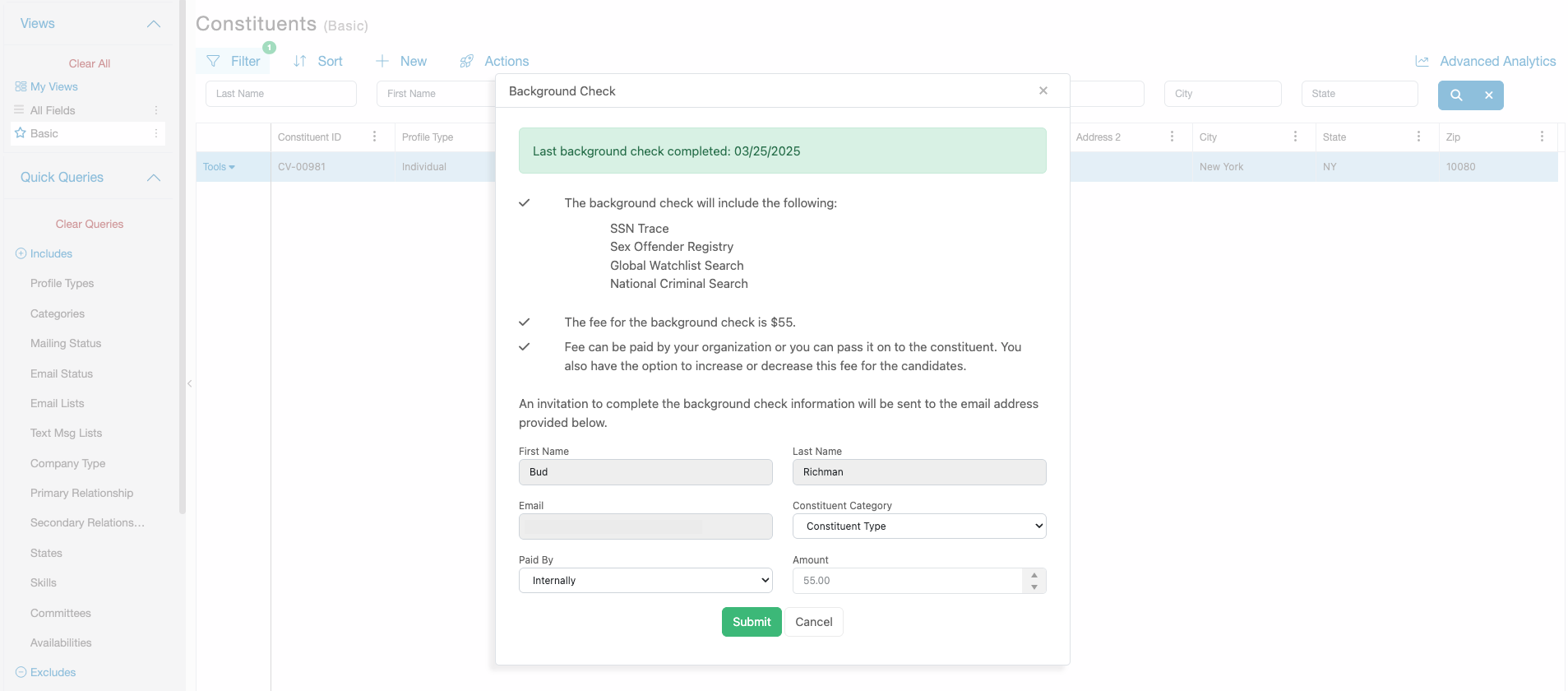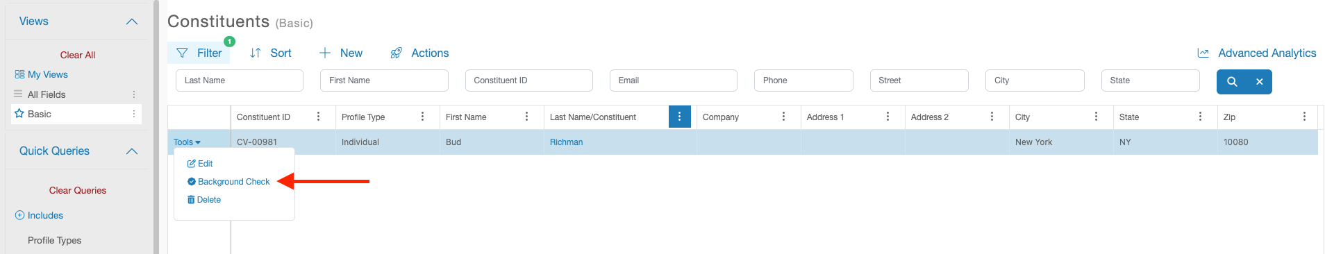 Background checks can now be run on any Individual Constituent appearing in your Constituent grid.