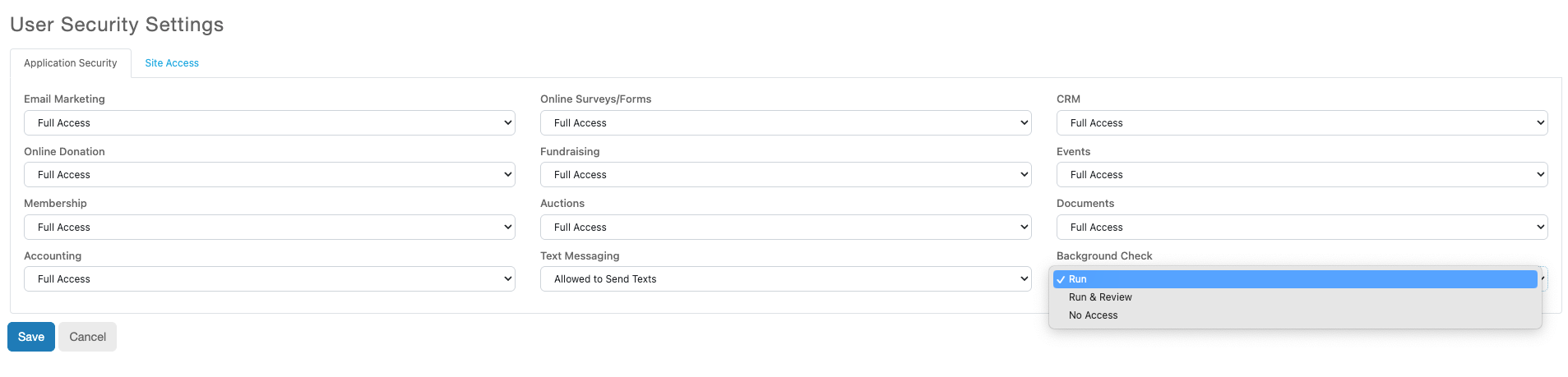 On the User Security Settings page, you'll find a dropdown labeled "Background Check" with three options: