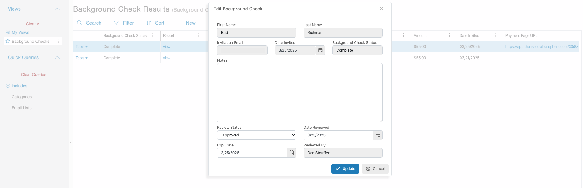 Invitation URL – The link for the constituent to submit their background check info and approval