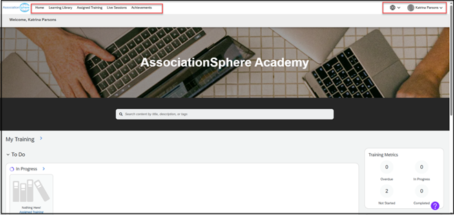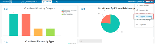 - When you log into AssociationSphere, you can find a link to the Support Academy in the User Settings menu under your user initials in the top right corner.