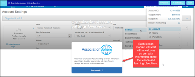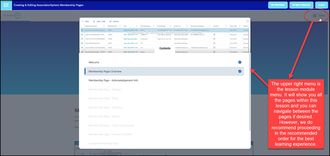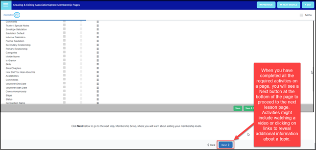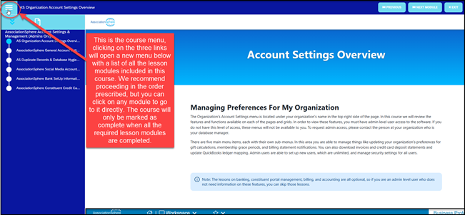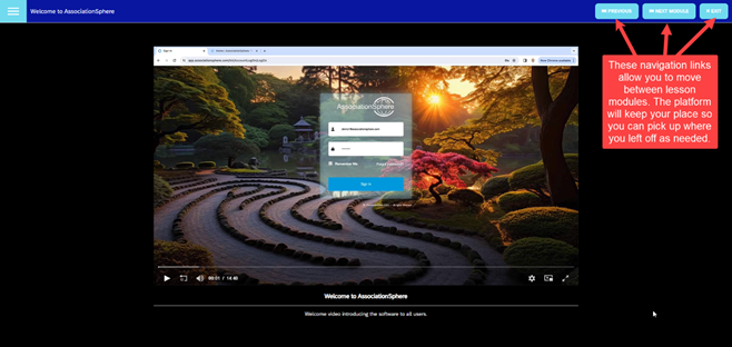 - Once you have watched the video, you can use the links in the upper right corner of the screen to go to the Next Module which will start the next course, AssociationSphere Basic Software Functions.