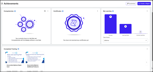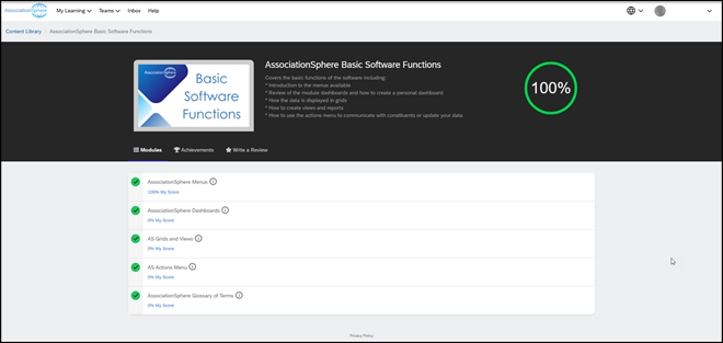 - The final menu option is Achievements. You can see a list of all your learning achievements so far. Coming soon will be options for certifications with AssociationSphere.